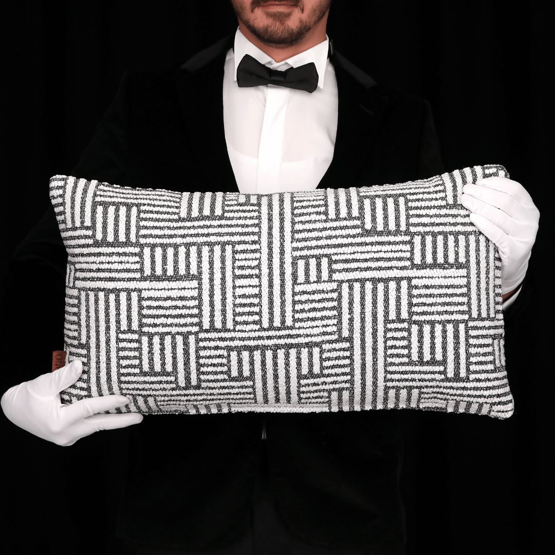 1 Adet 35*65 Abby (KTDD1003) Dokuma Bukle Modern Dokulu Jakarlı Etro Desen Yüksek Kalite Siyah & Beyaz Döşemelik Kumaştan Düz Dikişli Dekoratif Diktörtgen Bel Kırlenti (Kumaş Bilgisi: Axel 5030)