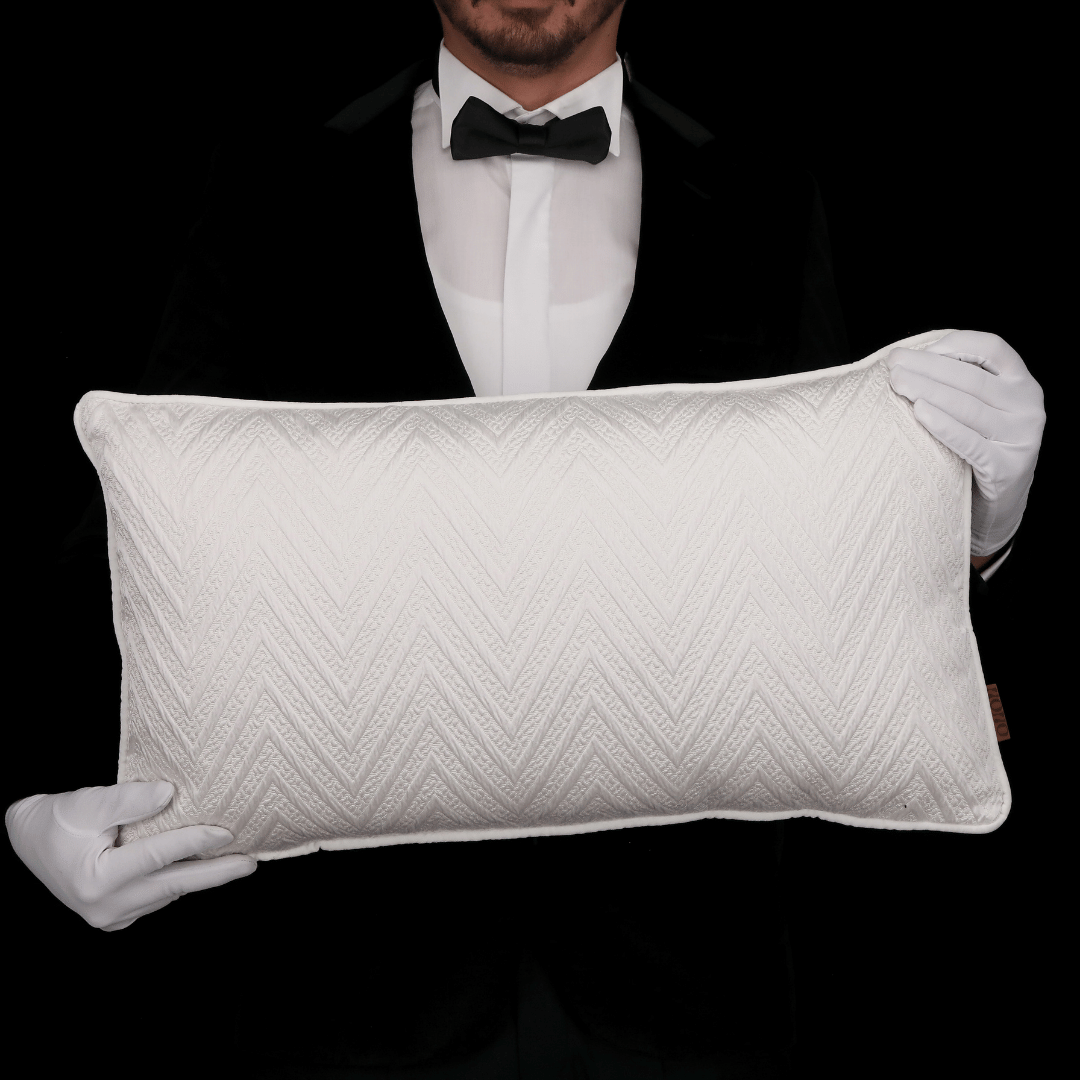 2 Adet 35*65 Fiona (KTB0430) Dokuma Viskon Saten Luxury Jakarlı Ön Yüzü Zigzag Desenli, Arka Yüzü Düz Taş Sedef Beyaz Desenli Döşemelik Kumaştan Biyeli Dekoratif Kare Kırlent (Kumaş Bilgisi: FLORANCE F502 & FLORANCE F503 / Hilton Velvet 147 Biyeli)