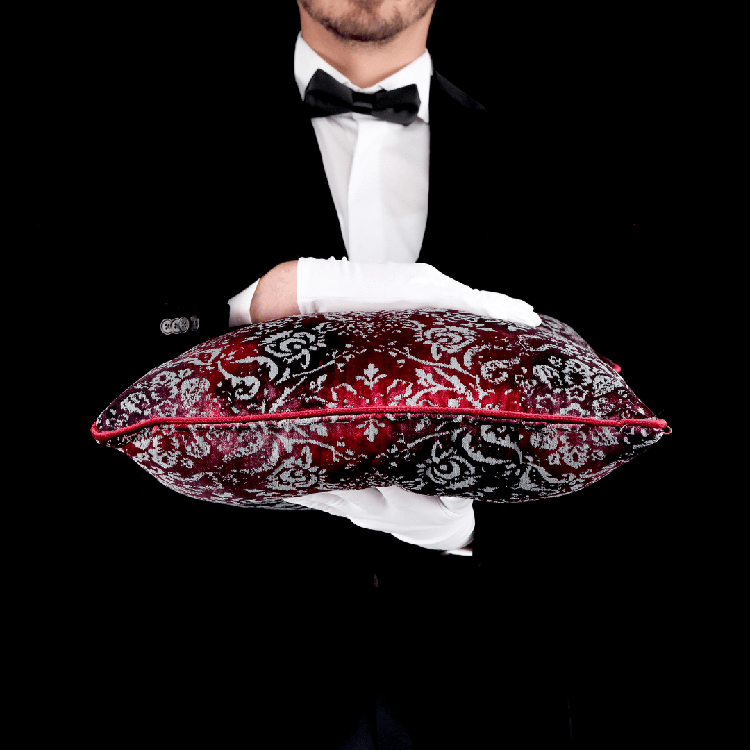 Oliva Damask Renkli Kadife 50*50 Biyeli Kırlent Kırmızı, İÇ DOLGUSU DAHİLDİR.