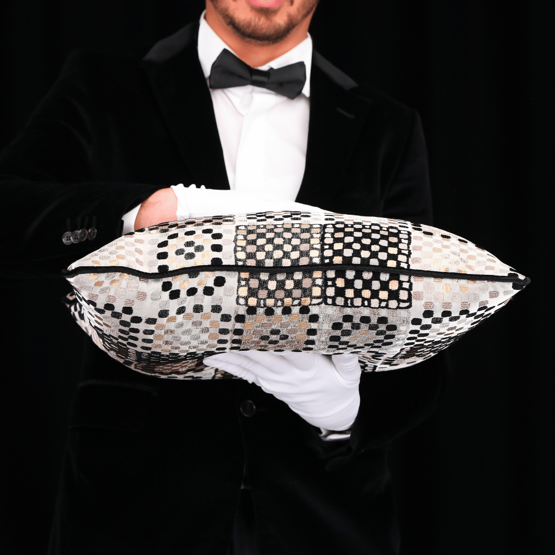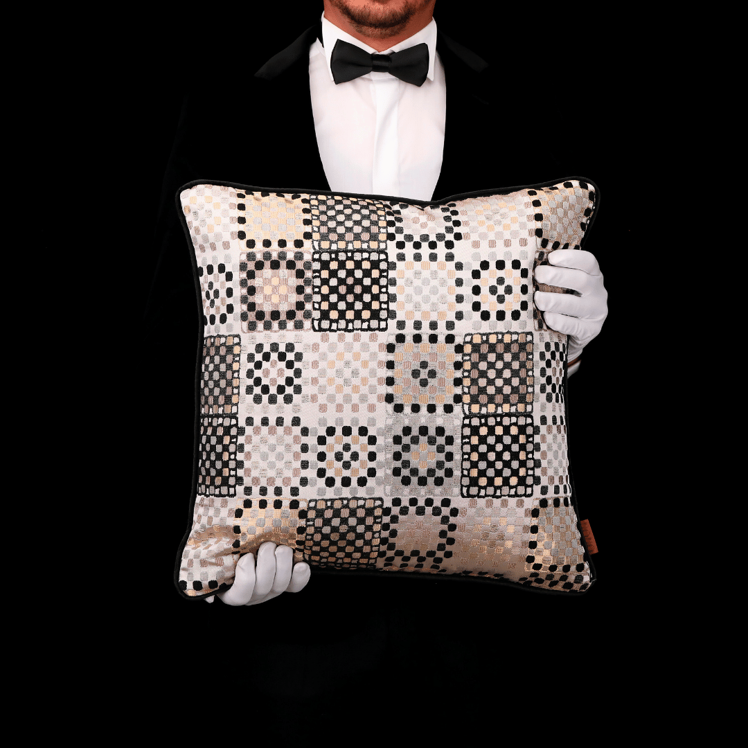 "Vicente" Geçmişten günümüze ulaşan eşsiz Benek motfileri, kendi tekstil lisanıyla yorumlayarak çok özel bir koleksiyonda biraraya gelmiş büyük bir emek ve incelikle hazırlanan Dokuma Viskon sarı & vizon parlak zemin üzerine kabartmalı şönil SİYAH benek desenli dokulu döşemelik kumaştan kenarları Siyah Biyeli 50*50 Dekoratif Büyük Kare Kırlent, İÇ DOLGUSU DAHİLDİR. (İç Dolgusu Ölçüsü 55*55)