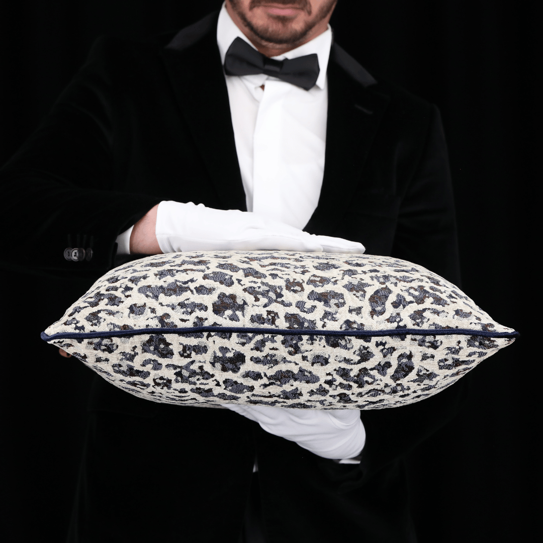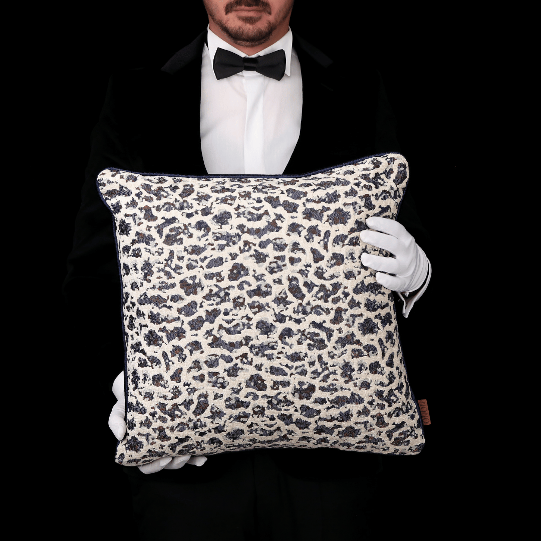 "Vicente" Geçmişten günümüze ulaşan eşsiz leopar motfileri, kendi tekstil lisanıyla yorumlayarak çok özel bir koleksiyonda biraraya gelmiş büyük bir emek ve incelikle hazırlanan Dokuma Viskon Lacivert & Kahve Parlak Zemin Üzerine Kabartmalı Şönil KREM leopar Desenli Dokulu Döşemelik Kumaştan kenarları lacivert Biyeli 50*50 Dekoratif Büyük Kare Kırlent, İÇ DOLGUSU DAHİLDİR. (İç Dolgusu Ölçüsü 55*55)