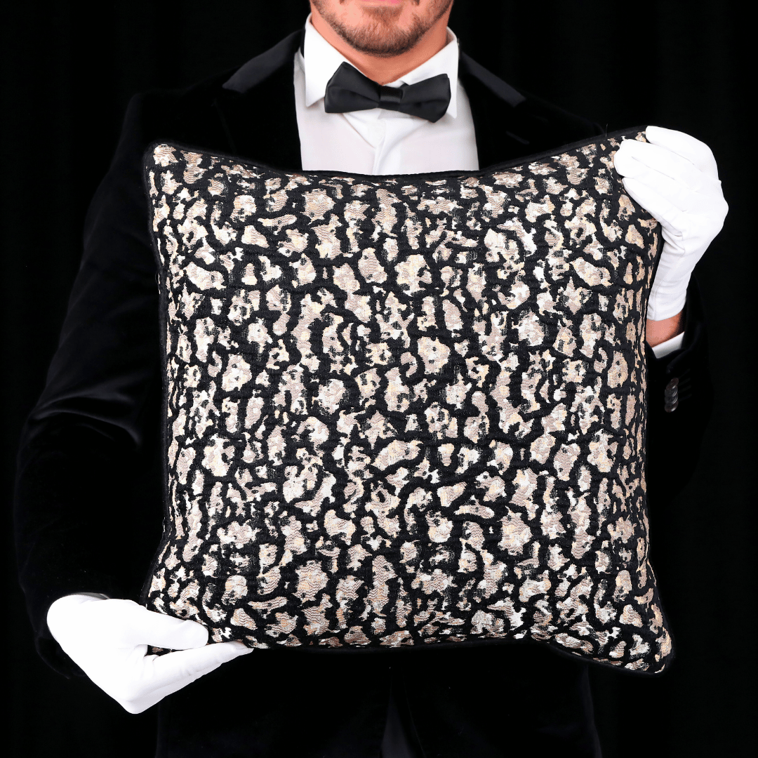 "Vicente" Geçmişten günümüze ulaşan eşsiz leopar motfileri, kendi tekstil lisanıyla yorumlayarak çok özel bir koleksiyonda biraraya gelmiş büyük bir emek ve incelikle hazırlanan Dokuma Viskon sarı & vizon parlak zemin üzerine kabartmalı şönil SİYAH leopar desenli dokulu döşemelik kumaştan kenarları Siyah Biyeli 50*50 Dekoratif Büyük Kare Kırlent, İÇ DOLGUSU DAHİLDİR. (İç Dolgusu Ölçüsü 55*55)