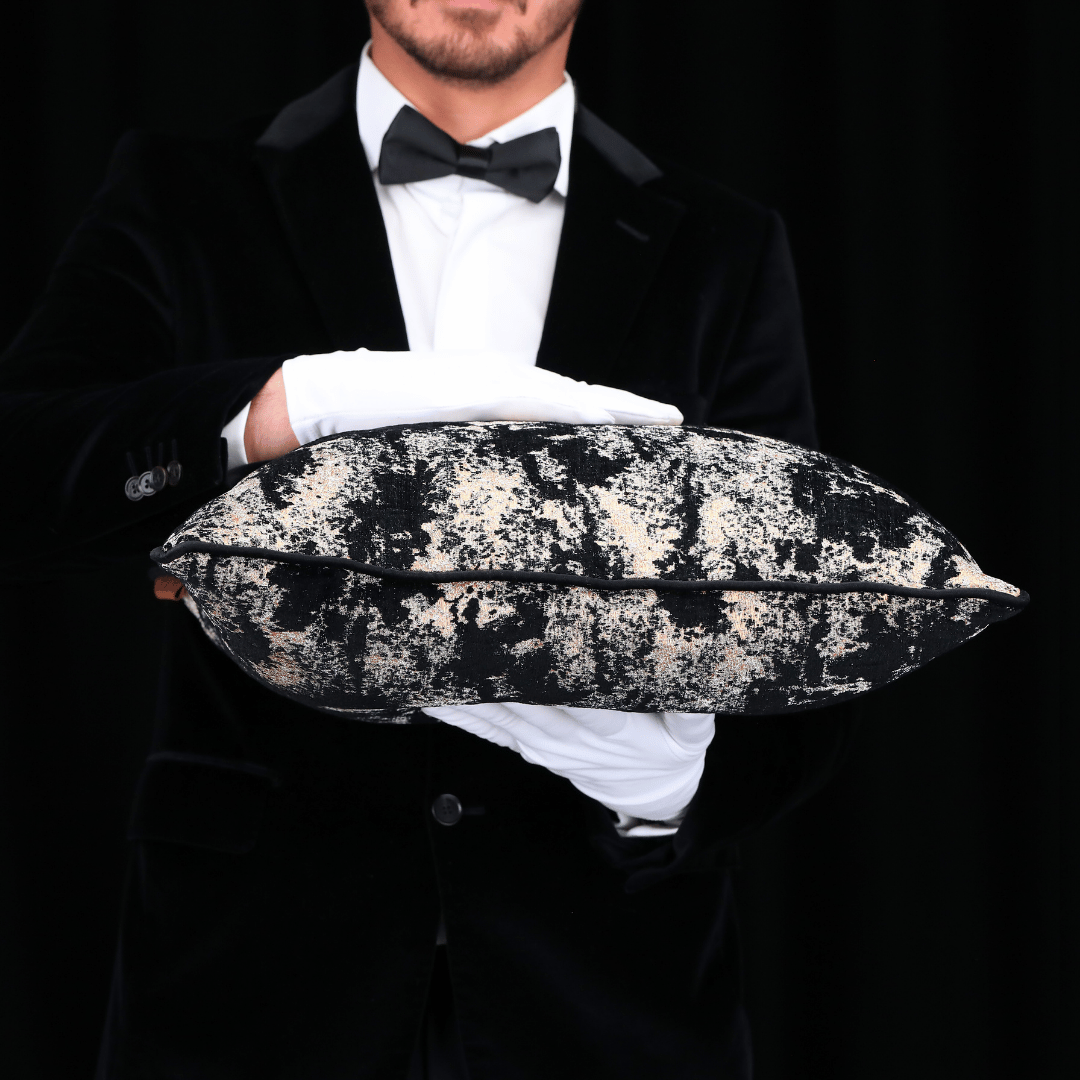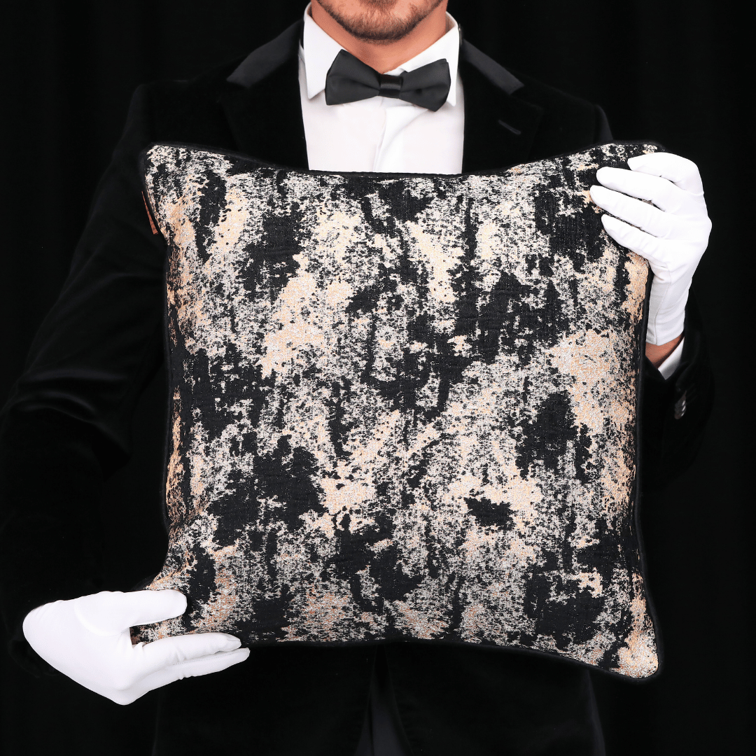 "Vicente" Geçmişten günümüze ulaşan eşsiz kabartma motfileri, kendi tekstil lisanıyla yorumlayarak çok özel bir koleksiyonda biraraya gelmiş büyük bir emek ve incelikle hazırlanan Dokuma Viskon sarı & vizon parlak zemin üzerine kabartmalı şönil SİYAH desenli dokulu döşemelik kumaştan kenarları Siyah Biyeli 50*50 Dekoratif Büyük Kare Kırlent, İÇ DOLGUSU DAHİLDİR. (İç Dolgusu Ölçüsü 55*55)