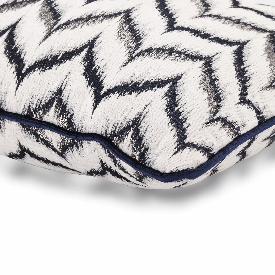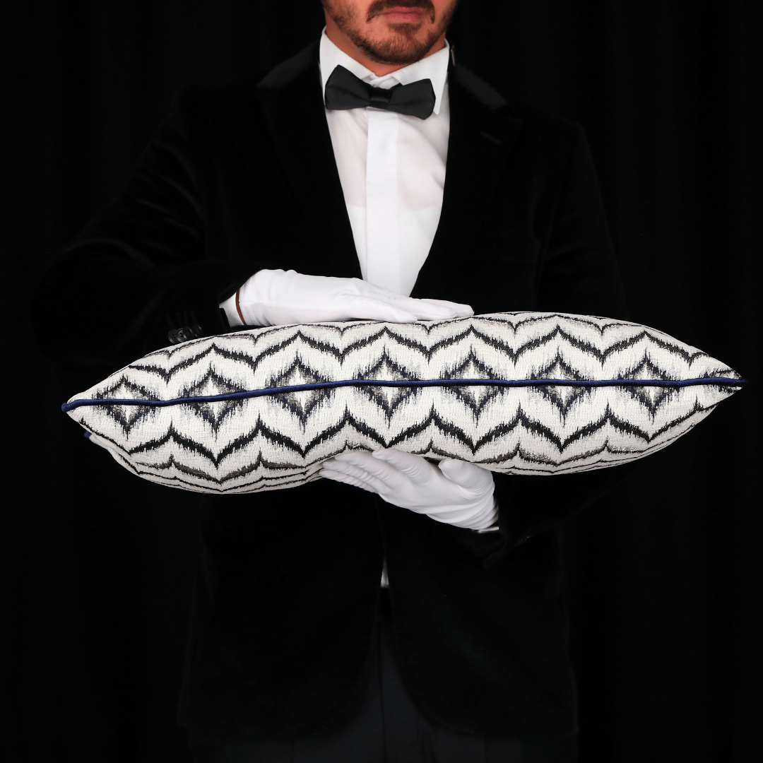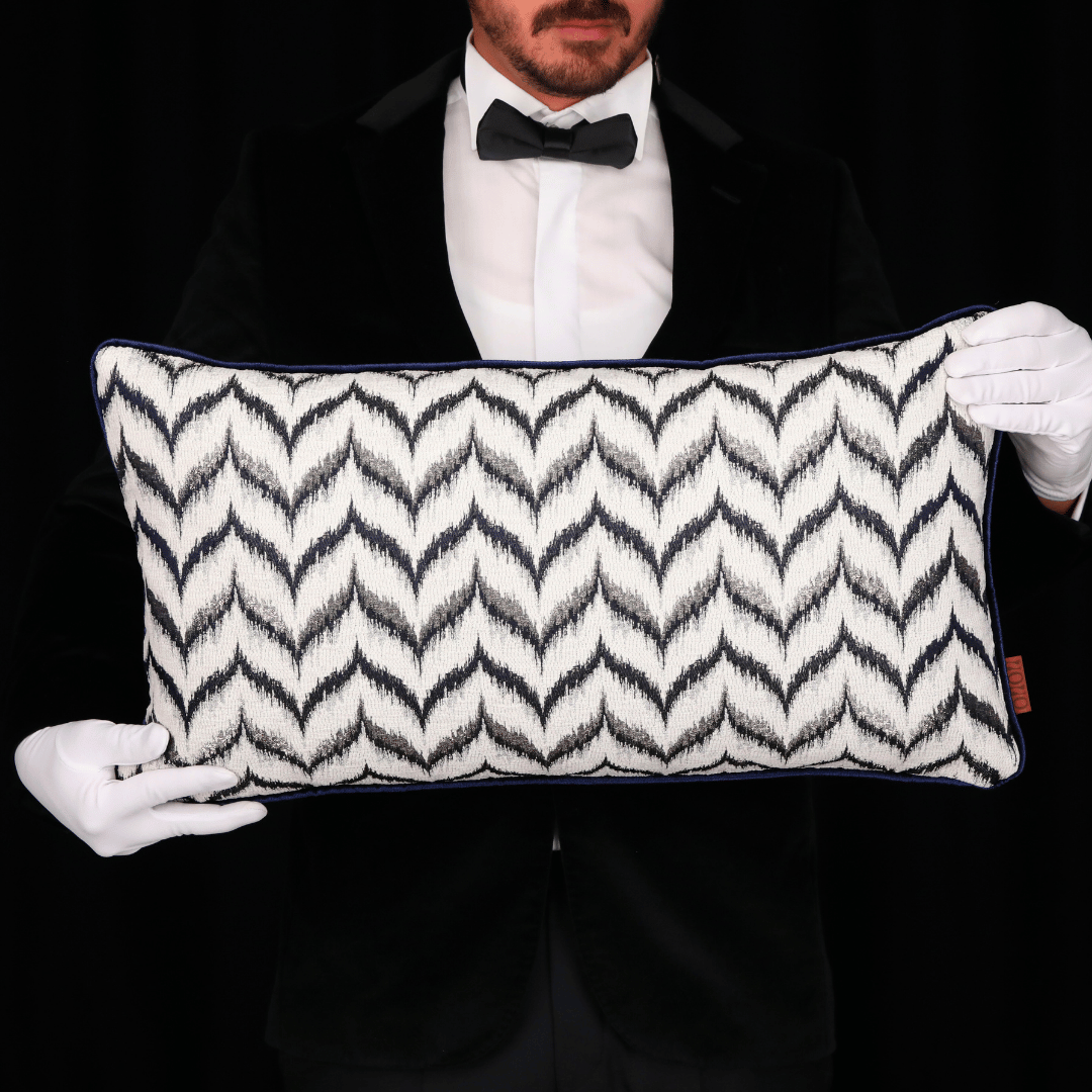 "Vicente" Geçmişten günümüze ulaşan eşsiz zigzag motfileri, kendi tekstil lisanıyla yorumlayarak çok özel bir koleksiyonda biraraya gelmiş büyük bir emek ve incelikle hazırlanan Dokuma Viskon Lacivert & Gri Parlak Zemin Üzerine Kabartmalı Şönil BEYAZ Zigzag Desenli Dokulu Döşemelik Kumaştan kenarları lacivert Biyeli 35*65 Dekoratif Dikdörtgen Bel Kırlenti, İÇ DOLGUSU DAHİLDİR. (İç Dolgusu Ölçüsü 40*70)